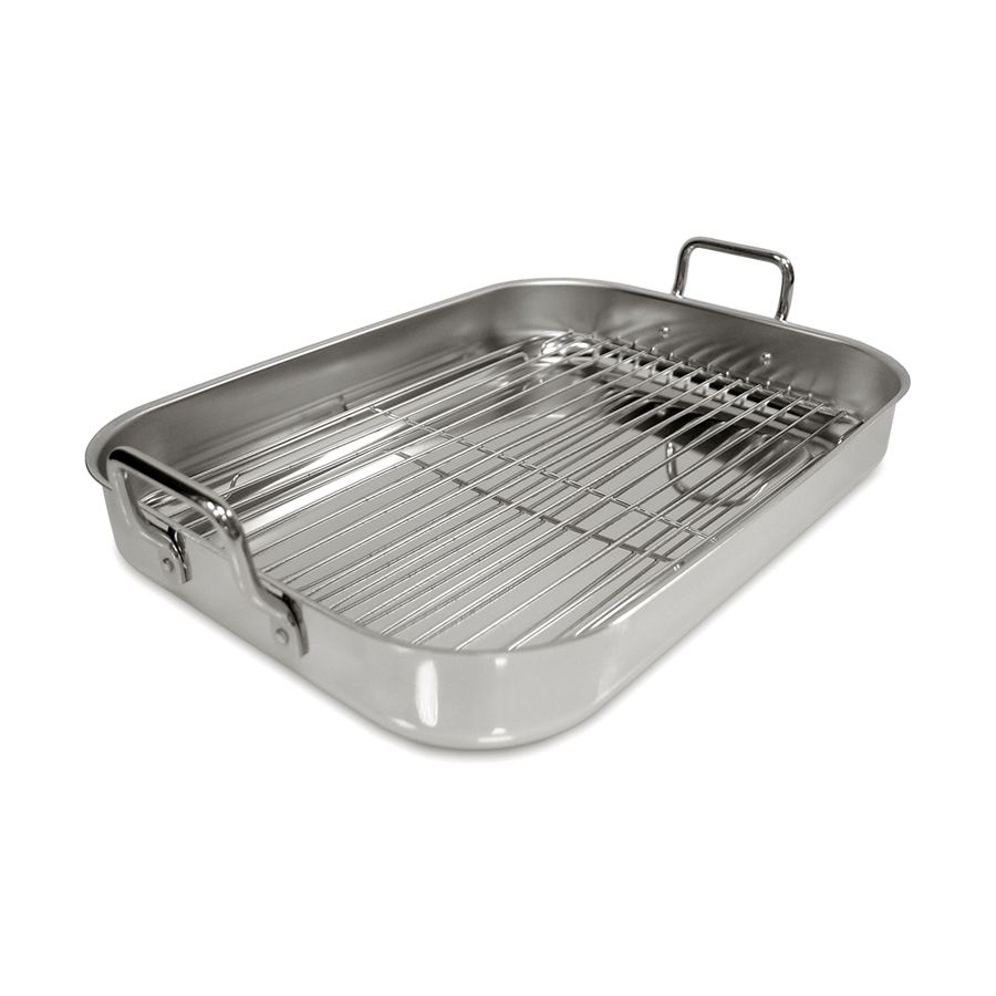 This refers to a high-quality stainless steel baking dish from the SADO collection by SILAMPOS. It comes with sturdy side handles for easy carrying and includes a removable grid (rack). The size is 36 by 27 cm, making it ideal for baking or roasting various dishes.